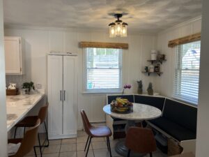 Right now, we have blinds, and in the breakfast area, some wood framing we made ourselves. I’m torn, because I think some Roman shades like these could add just a bit more warmth, but, first of all, I’m worried that the window over the sink, being flanked very closely by cabinets, could look too busy if we do that. I’m also somewhat curtain-hesitant broadly because I have a doozy of a dust allergy, and also, why are Roman shades so expensive??